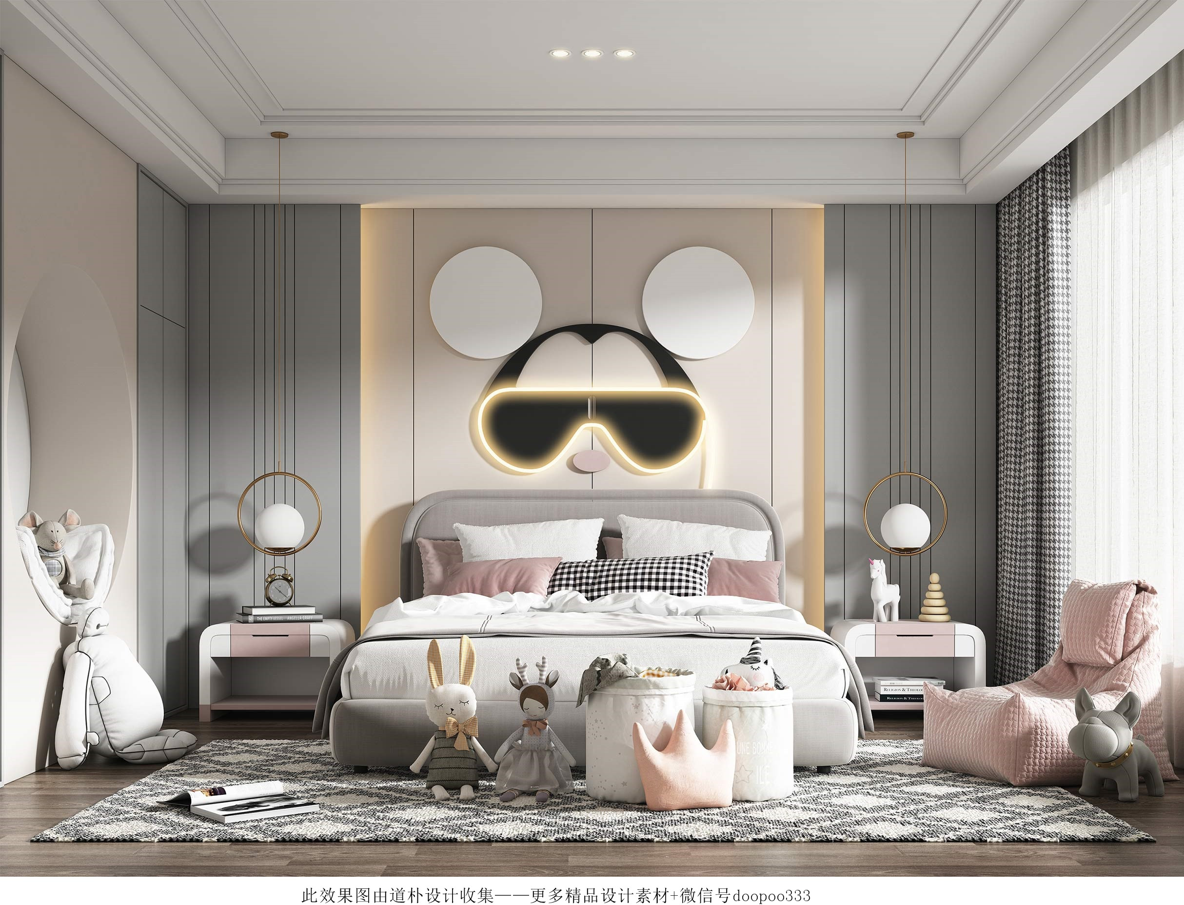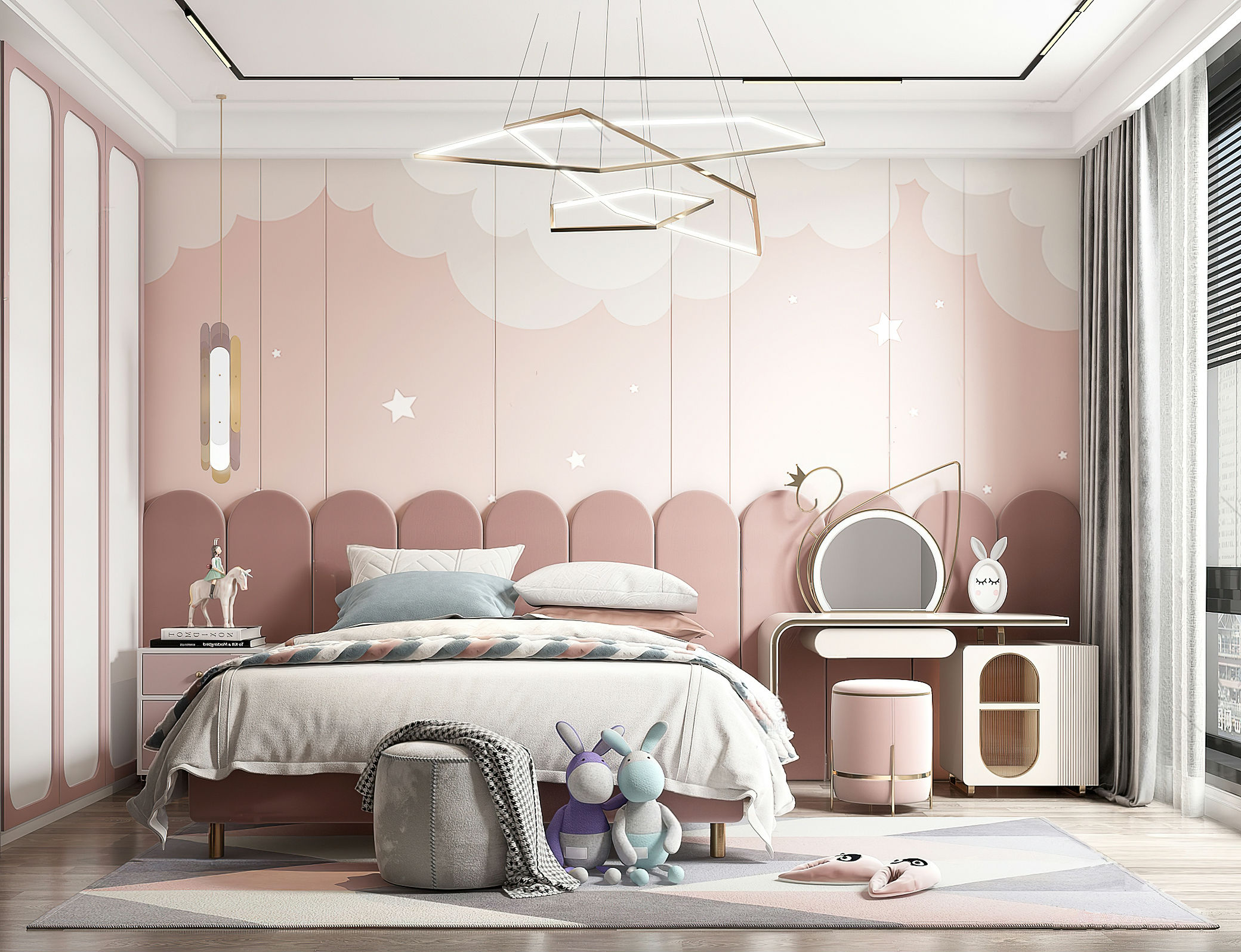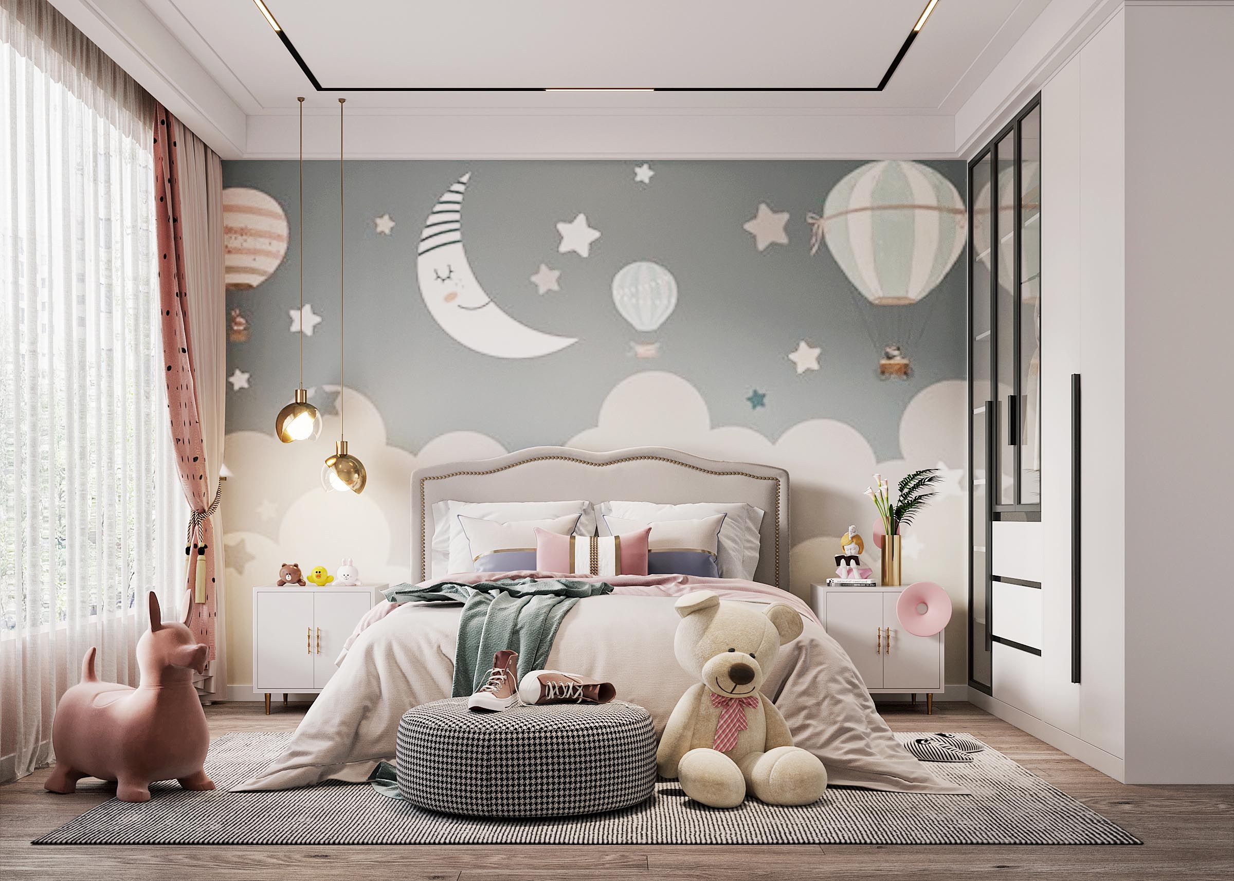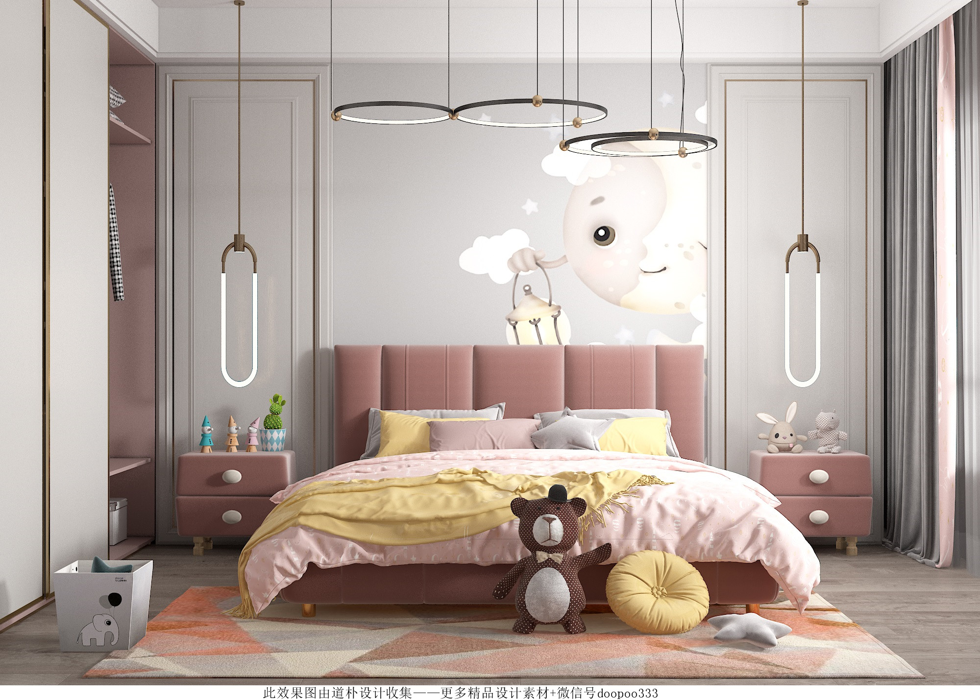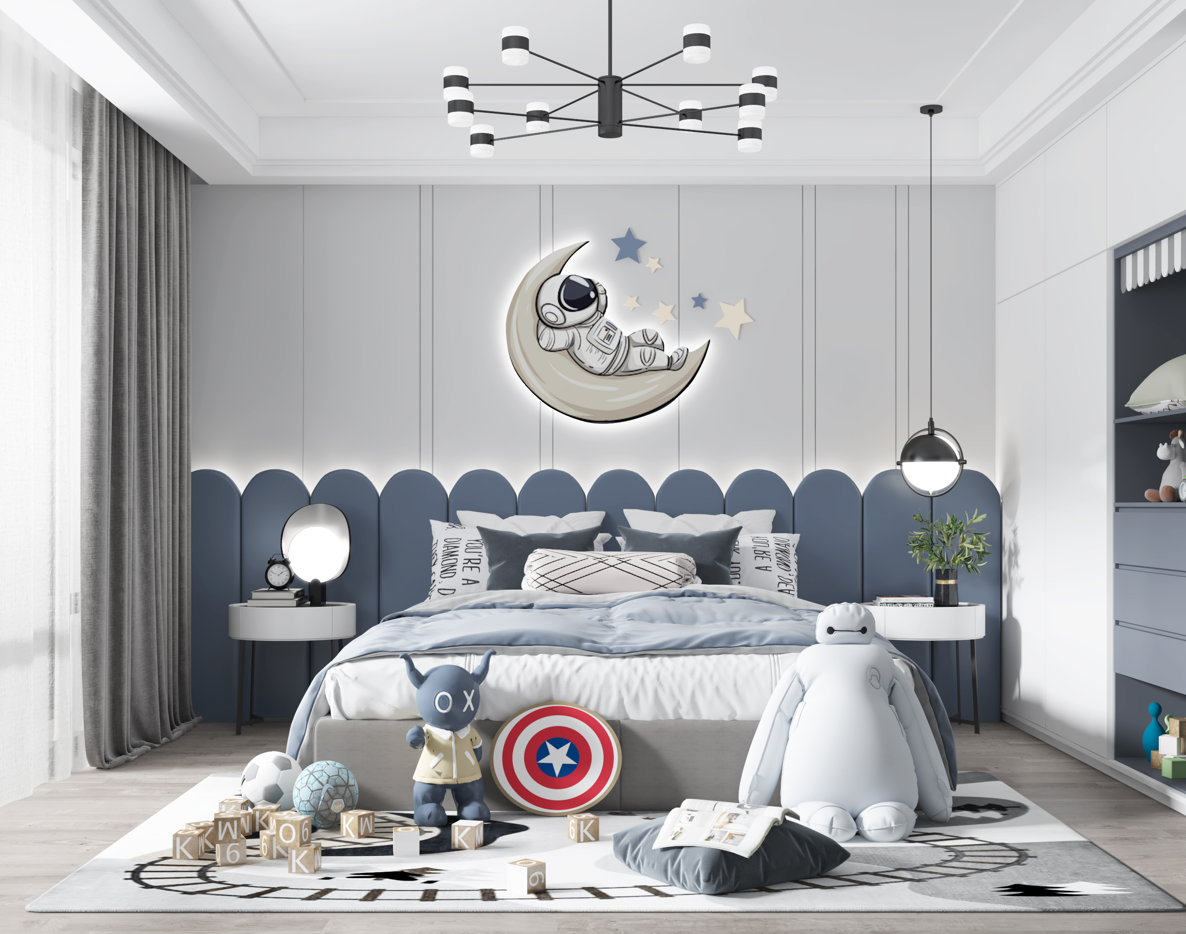 儿童房要有充足的照明,让房间内温暖明亮,这样才会让孩子更有安全感,房间内最好选择可调光的灯具。在选择灯具时,不要选择光线过于强烈的,色泽上要明亮不闪烁。