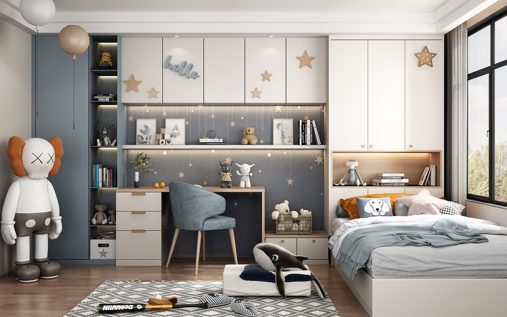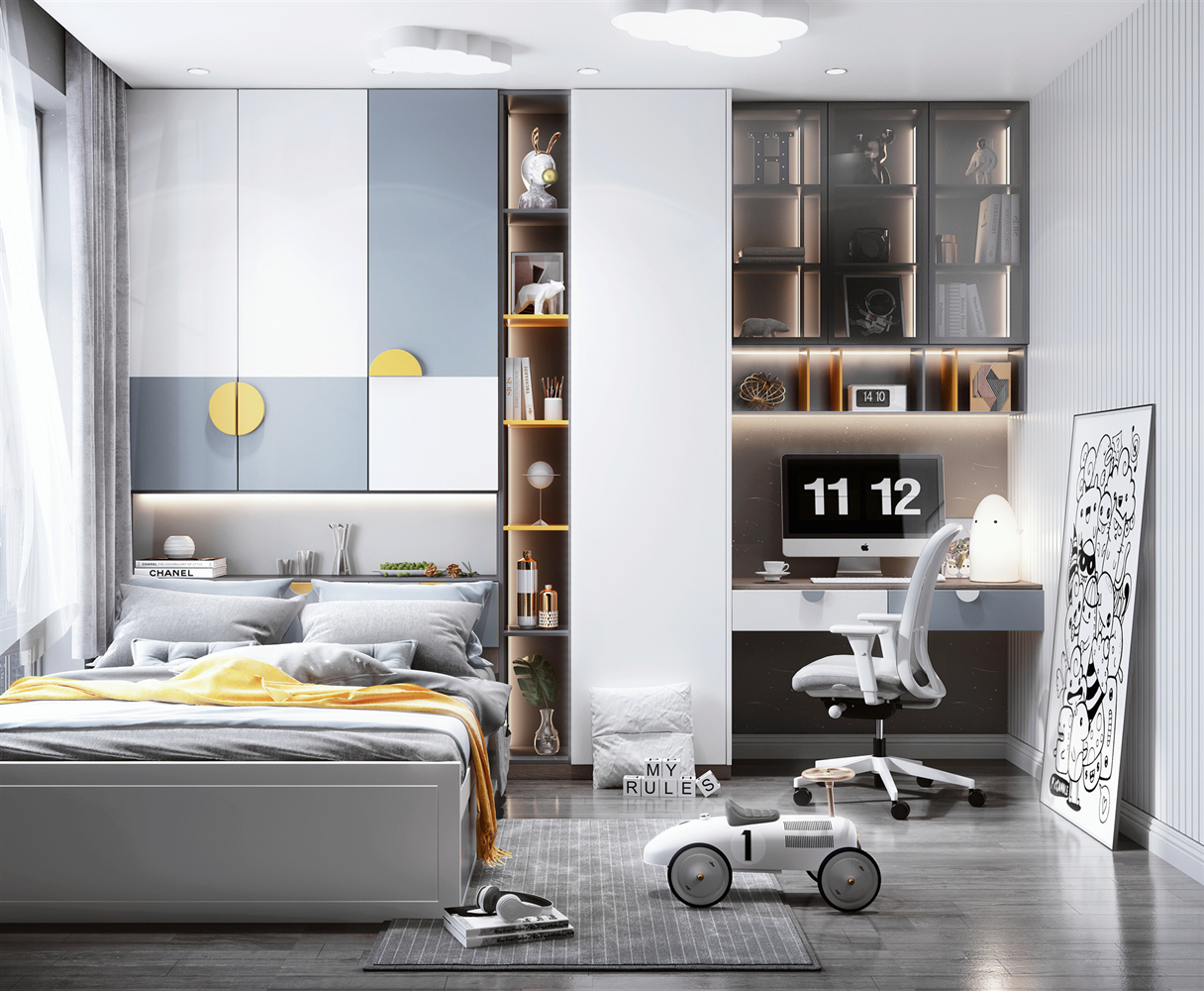 儿童房装修要注意收纳、学习区和活动区三个要素。和大人相比,孩子有衣服、书籍、玩具、杂物等物品,需要强大的收纳空间、细致的区域划分。把物品归纳好,才能给孩子更好的学习、生活和娱乐空间。